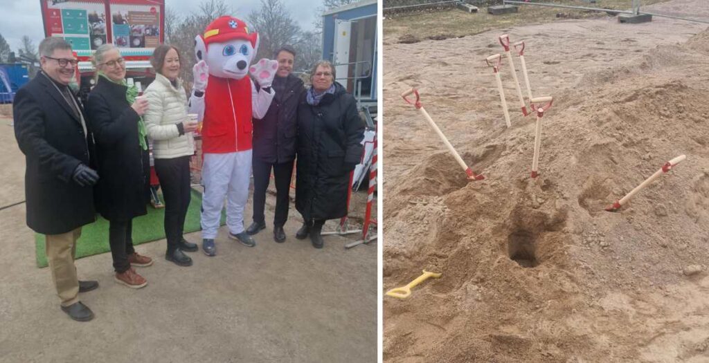 Mittstyret i Norrtälje tar första spadtaget för ny förskola, bredvid spadar stående i sand i dagsljus
