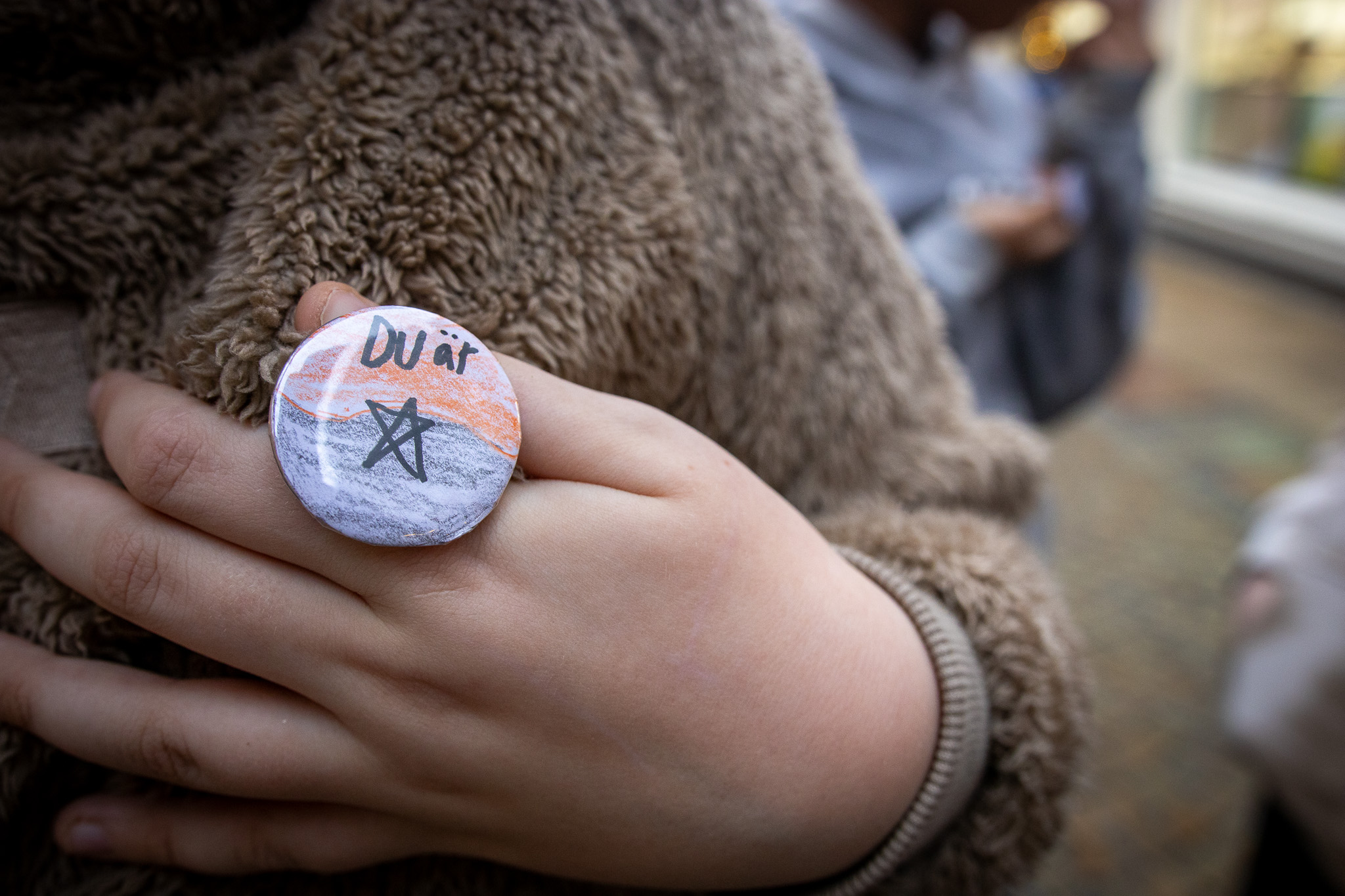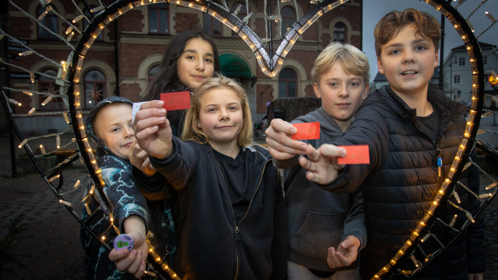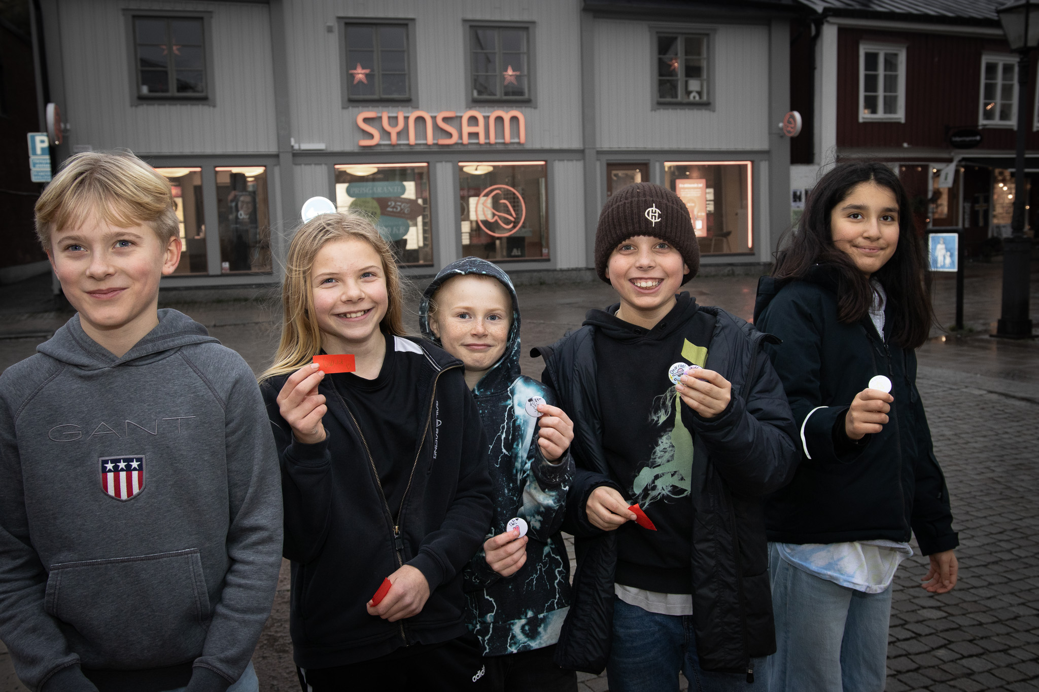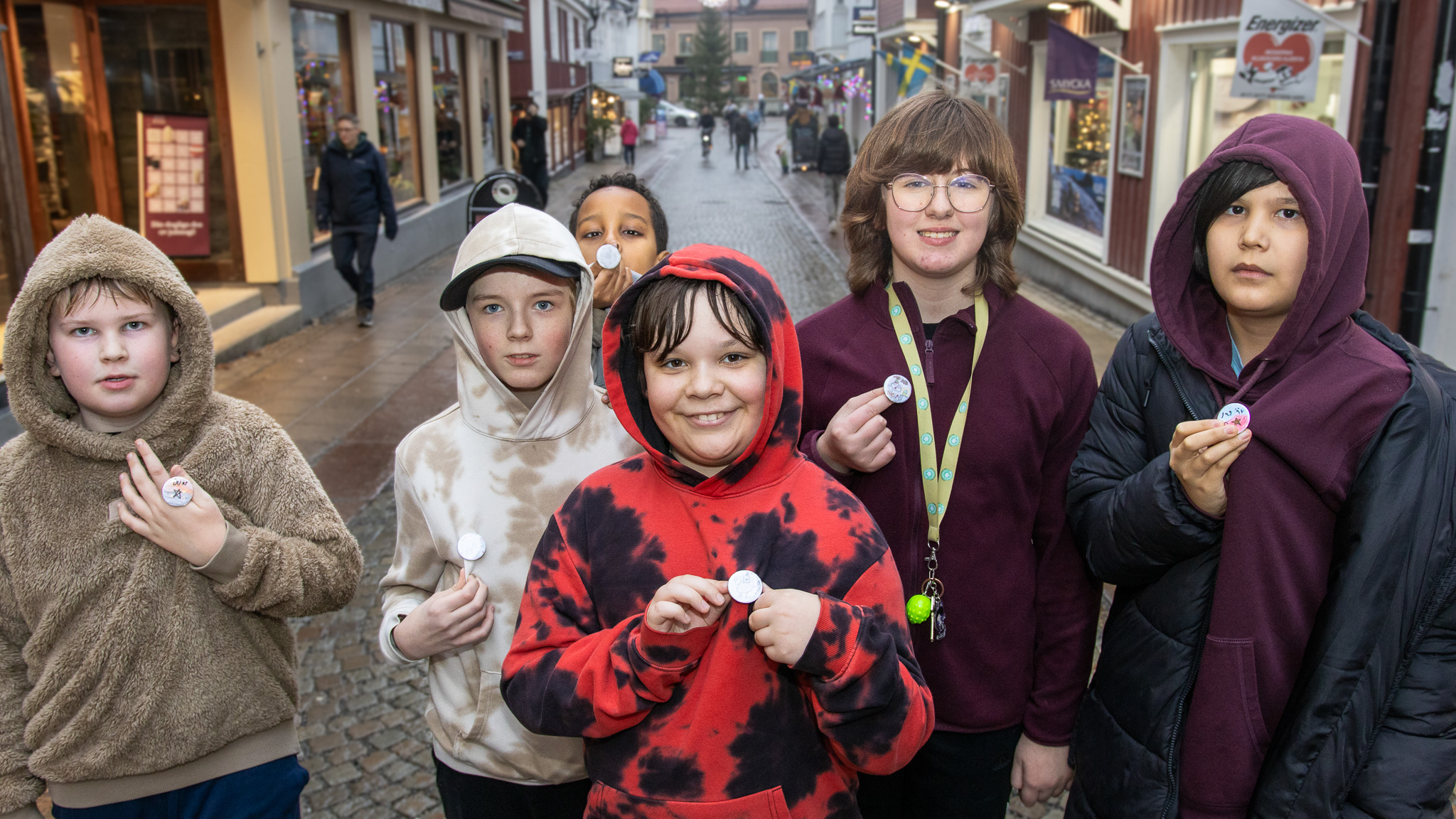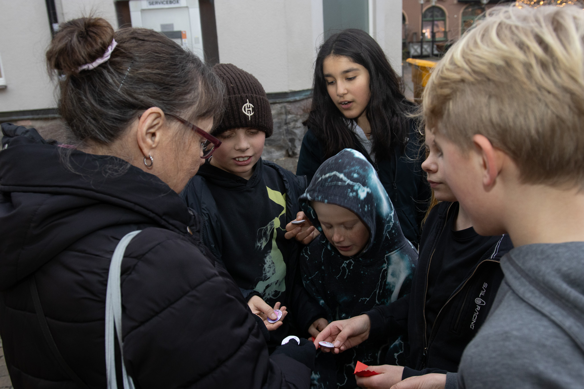 Under onsdagen tog Freinetskolan Hugin sitt värdegrundsarbete ut i centrala Norrtälje. Elever från förskola till högstadium deltog i en gemensam promenad där de delade ut egengjorda pins, budskap och vänliga ord till människor de mötte.