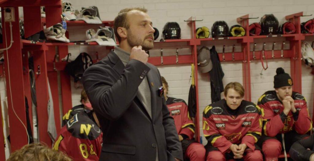 Anders Söderström talar inför truppen i omklädningsrummet.